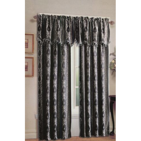 The Sienna is great for any room of your house. The Sienna is a luxucious crushed metallic jacquard window covering. The Sienna has a a crushed feel with metallic leaf pattern. The Sienna valance is a scalloped valance, the panel is a tailored panel. Choose from six colors: beige, black, brick, cocoa, ivory and purple. Fabric is 100% Polyester.